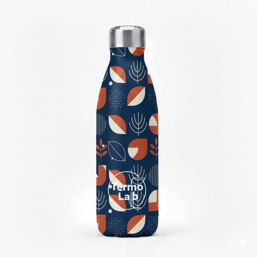 Botella reutilizable de 600 ml con diseño “Lab Leaf”, un estampado moderno de hojas en tonos azul, blanco y naranja. Resistente, cómoda y perfecta para mantener tus bebidas frías o calientes durante horas.